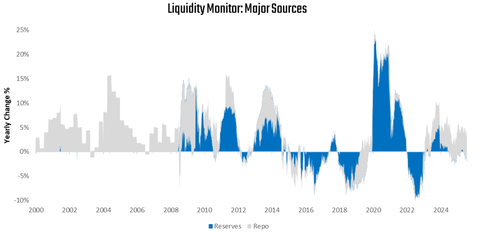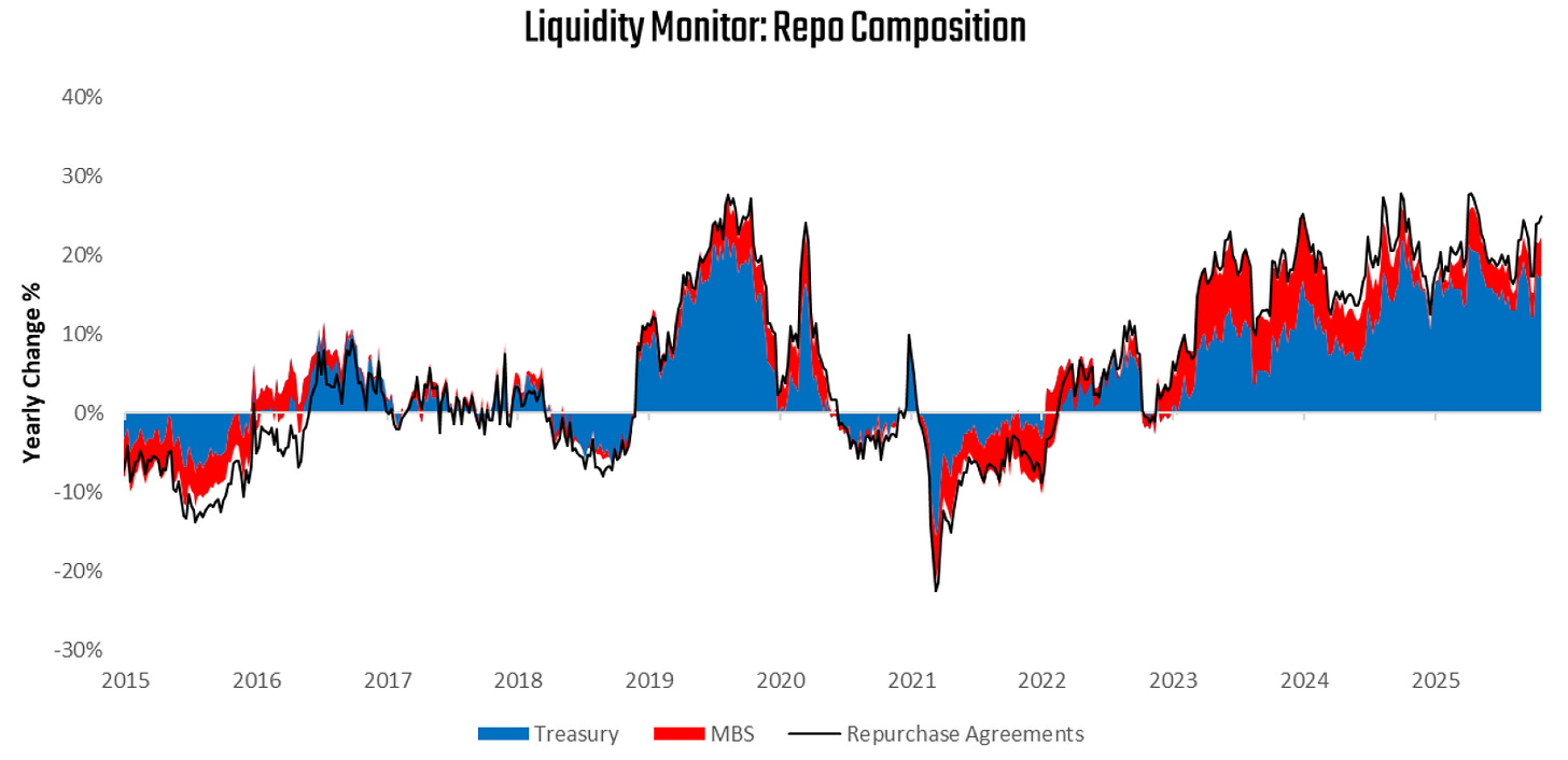 With the Federal Reserve’s balance sheet actions slowing, the dominant driver of liquidity dynamics remains the repo market. We isolate this below: