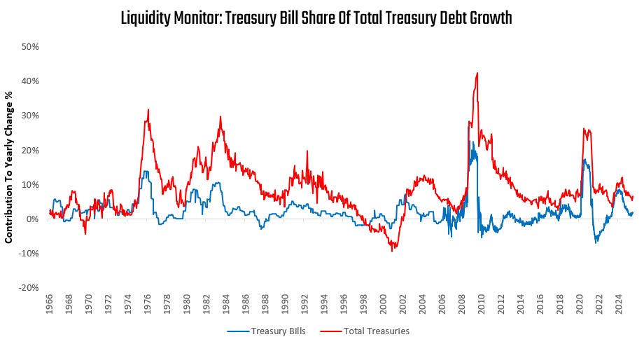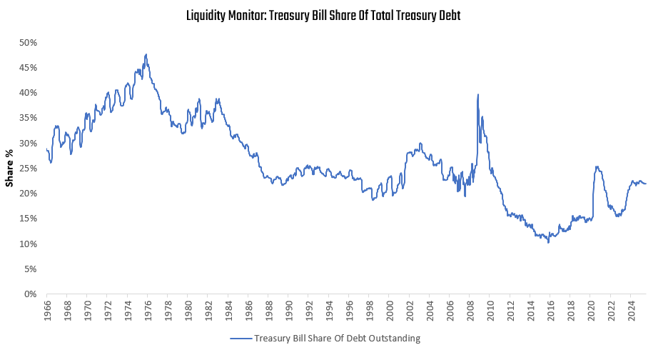 Next, we turn to the other side of government liquidity, i.e., Treasury bill supply. Much like the Fed, the Treasury can impact liquidity conditions by increasing the supply of liquid assets, primarily through Treasury bill issuance. We begin by showing the secular context for this liquidity supply by showing the treasury bills outstanding as a share of total treasury debt.