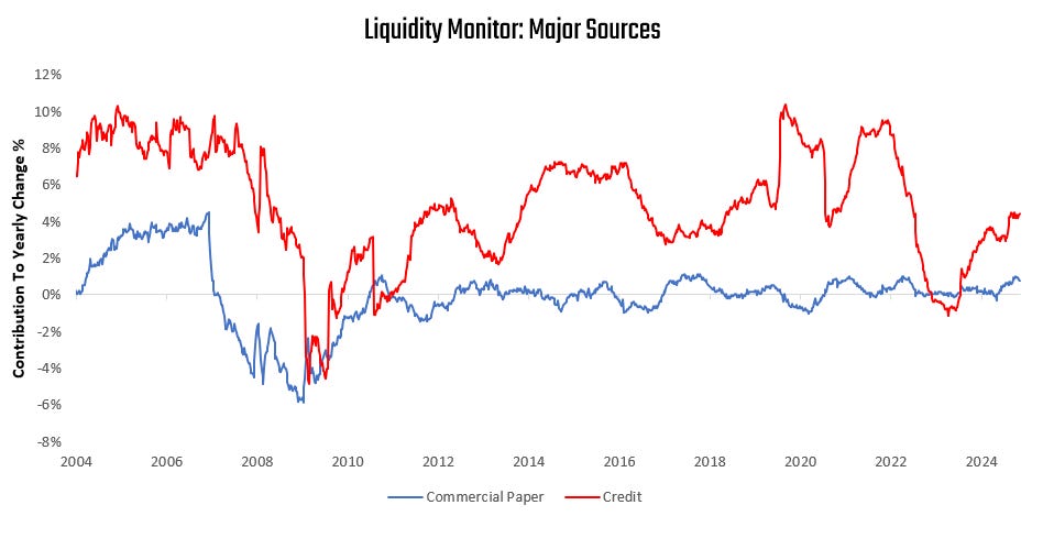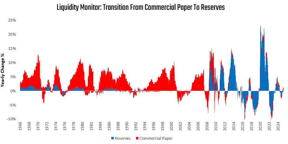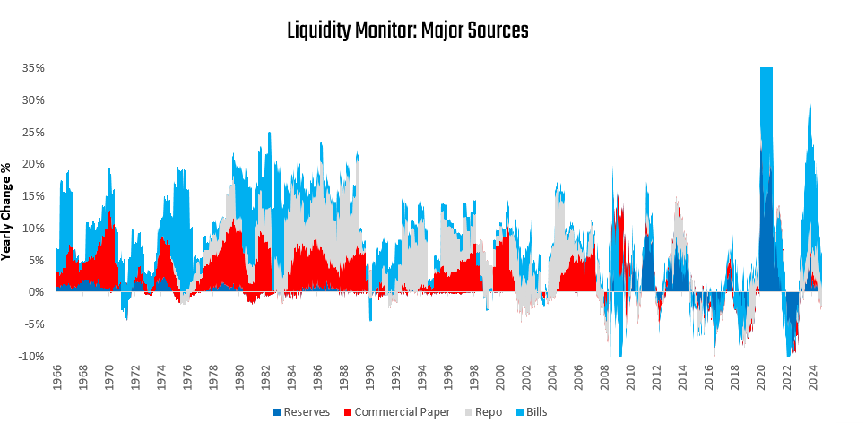 Liquidity is the flow of cash and cash-like assets that facilitate spending in the economy. Nominal dollar values and the relative risk profile of the various sources of liquidity determine liquidity. We begin our tracking of liquidity conditions by sharing the weighted growth rate of the major sources of liquidity: reserves, treasury bills, commercial paper, & repurchase agreements.