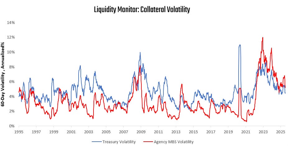 With collateral volatility low and measures of short-term funding risk showing little strain, liquidity can continue to expand unfettered.