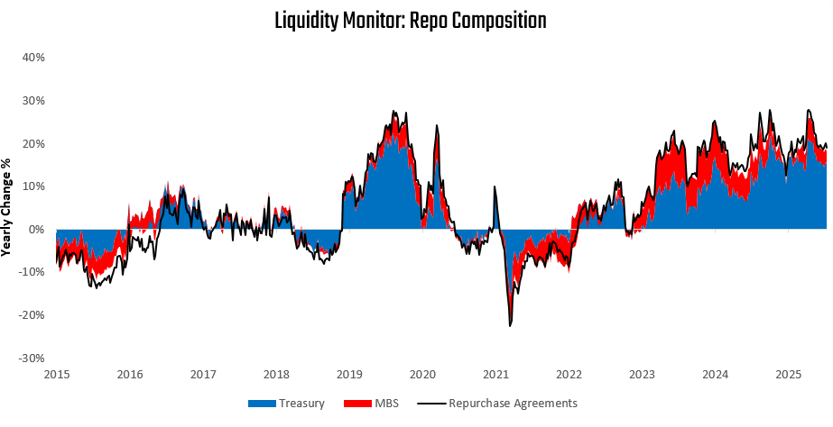 While private sector activity in the form of commercial paper has dwindled, other forms of private sector activity have flourished. Particularly, repo markets have expanded to become a dominant driver of financial markets. Repo market activity is largely contingent upon the supply of collateral, particularly in the form of Treasury & MBS securities. We show the composition of repo growth below: