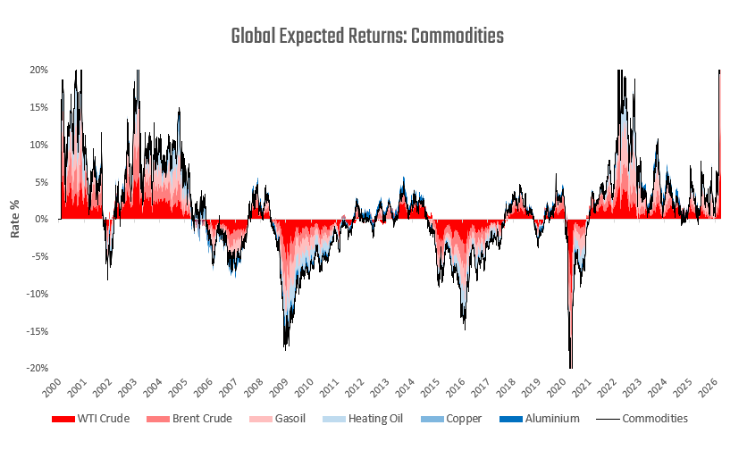 Thus, we think that if there is a time to own commodities, it is in this type of backdrop. However, we need guardrails against a sudden turn in these conditions. Much of today’s regime’s dynamics are contingent upon the policy actions of the US administration and Iran's reaction function. A quick de-escalation of the military conflict will unwind speculative positioning in energy, but is unlikely to fully restore global supply in the near term or to remove the geopolitical risk premium now priced into global energy markets. As such, the biggest threat to energy exposure today is a military de-escalation-induced unwind in positioning.