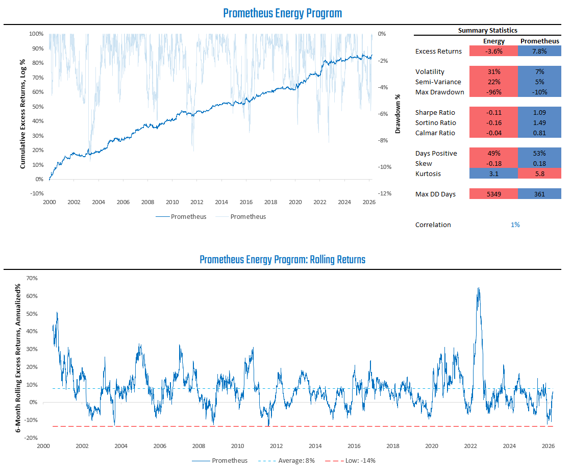 Looking across Expected Returns, Positioning Risks, and Short-Term Regimes— we think energy exposure continues to make sense in the current backdrop. However, being prepared for a speculative unwind in sizing and drawdown controls remains imperative for navigating this environment optimally. If Expected Returns, Positioning, and Short-Term Regimes all align, conditions will be in place for significant long exposure. Until then, a more cautious approach is warranted. Clients of Prometheus Institutional can track the evolution of these conditions daily. Email us at info@prometheus-research.com for access.