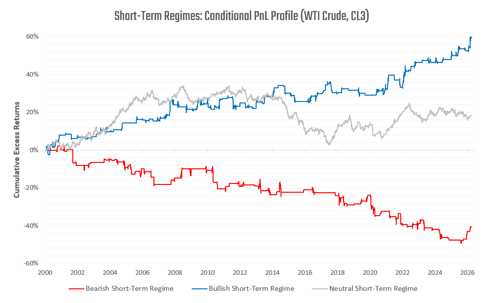 Based on the program's underlying signals, we can classify regimes as Bullish, Bearish, or Neutral. The objective is to identify the highest-signal periods for energy markets, not every signal: