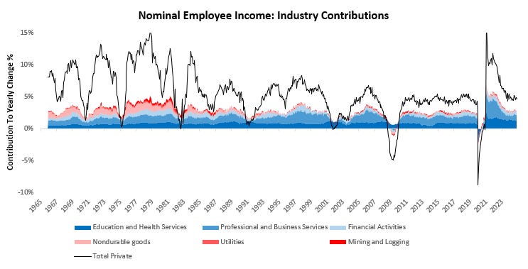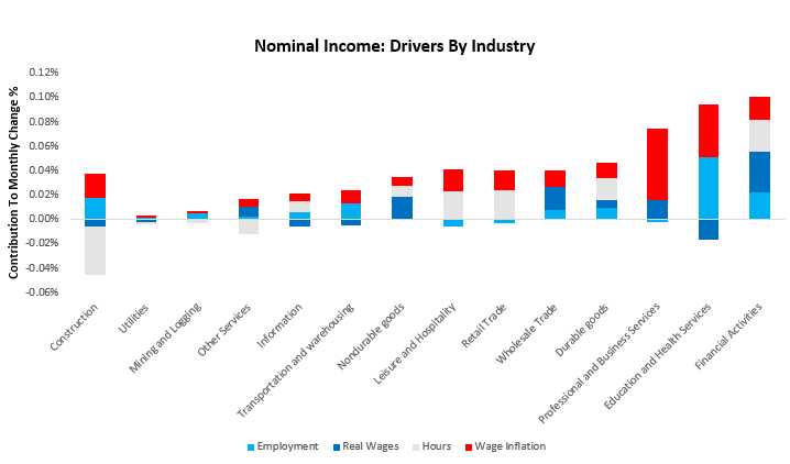 We further decompose these macroeconomic drivers by industry. Below, we visualize the contributions to total nominal income coming from each industry, broken into its drivers, ranked from left (weakest) to right (strongest). As we can see below, nominal income was generally positive, with Financial Activities contributing the most to strength and Construction dragging on nominal income growth: