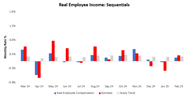 Our latest estimates for February showed real employee income increased by 0.21%. This data showed a deceleration in the quarterly trend relative to the one-year trend. We show the evolution of the sequential data below: