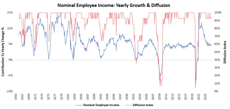 Digging into the industry-level data, we find that nominal employee income over the last year has largely been positive, with Education and Health Services, Professional and Business Services, and Financial Activities contributing strength (shown in shades of blue). On the other hand, Mining and Logging, Utilities, and Nondurable goods are the weakest areas of income (shown in shades of red). Additionally, we show the yearly change in the data, along with the underlying diffusion of industry growth: