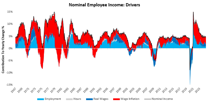 For further perspective, we show how nominal employee income has evolved over the last year, with nominal income growth of 4.62%, 2.02% of which came from real growth. Over the last year, nominal income has primarily been driven by Wage Inflation, which has expanded by 2.58%. We display this below: