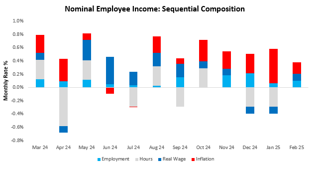 This estimated real income data came alongside a nominal income change of 0.38%. We can decompose this nominal wage growth into growth from employment, hours worked, real wages, and wage inflation, which contributed 0.1%, 0%,0.1%, and 0.18%, respectively, to nominal income. We show the sequential evolution of this compositional data below: