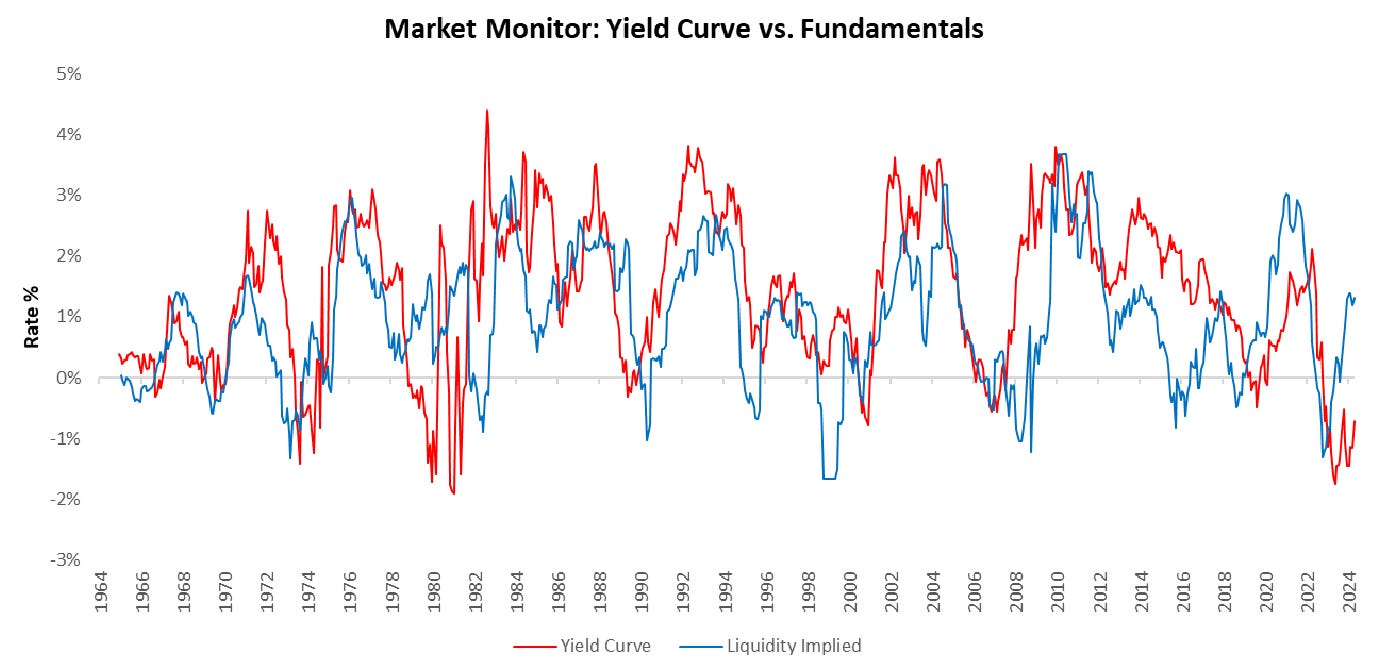 While liquidity is not directly measurable in markets, history has shown the yield curve to largely be a strong barometer of liquidity conditions. Above, we show the fitted values of our liquidity gauge to the yield curve. As we can see, the yield curve remains cheap to current liquidity dynamics.
