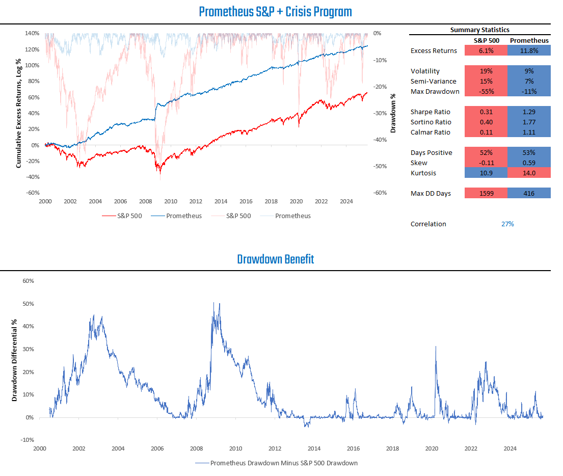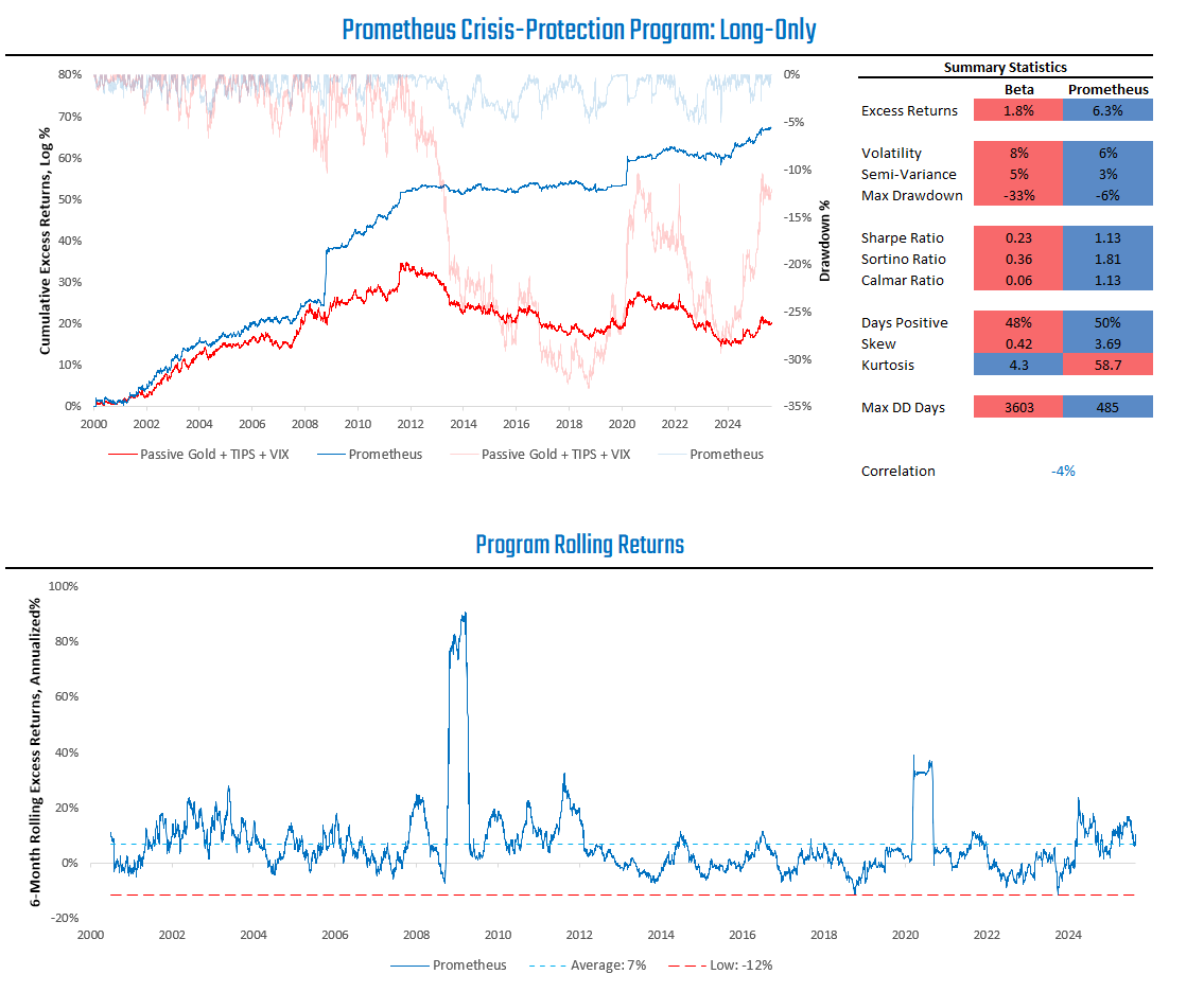 As we can see above, the Prometheus Crisis Protection Program significantly outperforms a passive mix of Gold, TIPS, and VIX.