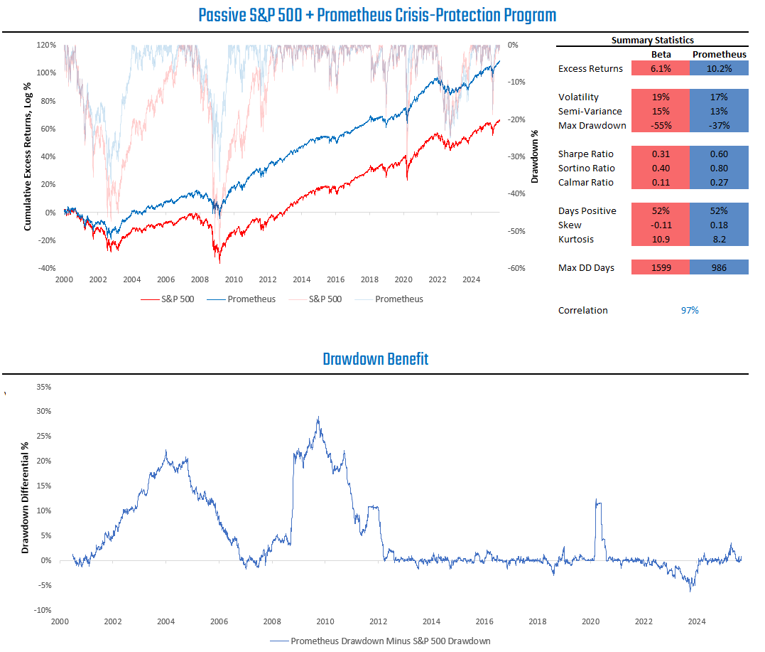 For a variety of reasons, many investors want to maintain passive exposure to the S&P 500. While we don’t think 100% passive exposure is optimal, it is often the reality of many investors. Given the diversifying characteristics of the Prometheus Crisis Protection Program, we think it can offer investors significant value by adding incremental returns and reducing drawdowns. This can be achieved through the use of leveraged ETFs or futures, which allow us to get access to capital-efficient exposure to the S&P 500 while freeing up capital to invest in the Prometheus Crisis Protection Program.