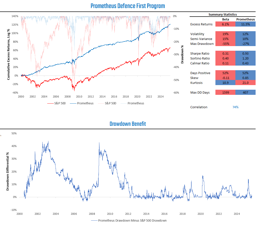 Now, while a completely passive approach may be attractive to some, others may prefer a more active approach to investing. Enter our Defence First Program. Every week, our Crisis Protection Program chooses how much to allocate to Gold, TIPS, and VIX. However, there can often be large amounts of cash left over, as the reward-to-risk justifies taking less than 100% exposure. Given that these exposures are based upon signals to evaluate the attractiveness of holding equity diversifiers, the lack of signals to hold them may be interpreted as an indication to own equities. Therefore, we can take the cash holdings from our Prometheus Crisis Protection Program and invest in the S&P 500. We show the simulated performance profile of doing so: