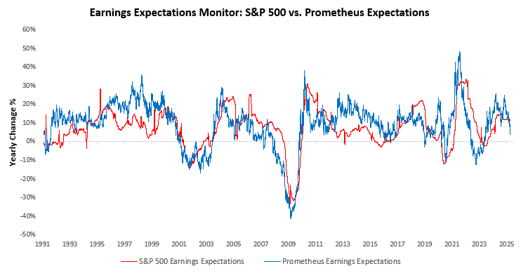Given the uncertainty around the economic environment, we also share the latest readings from our Earnings Expectations Monitor, which aggregates data from financial conditions and fundamental earnings drivers to estimate the likely path for S&P 500 earnings expectations: