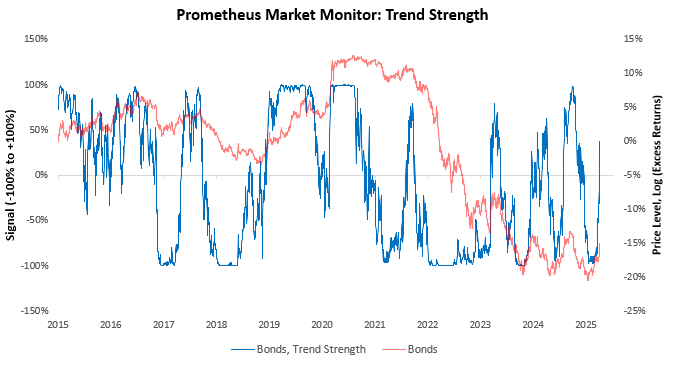 Aggregating measures of macro trend, mean reversion, expected returns, and fundamental economic conditions, our systems are looking to position the Prometheus ETF Portfolio as follows: