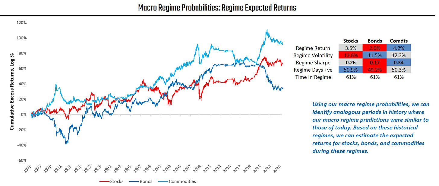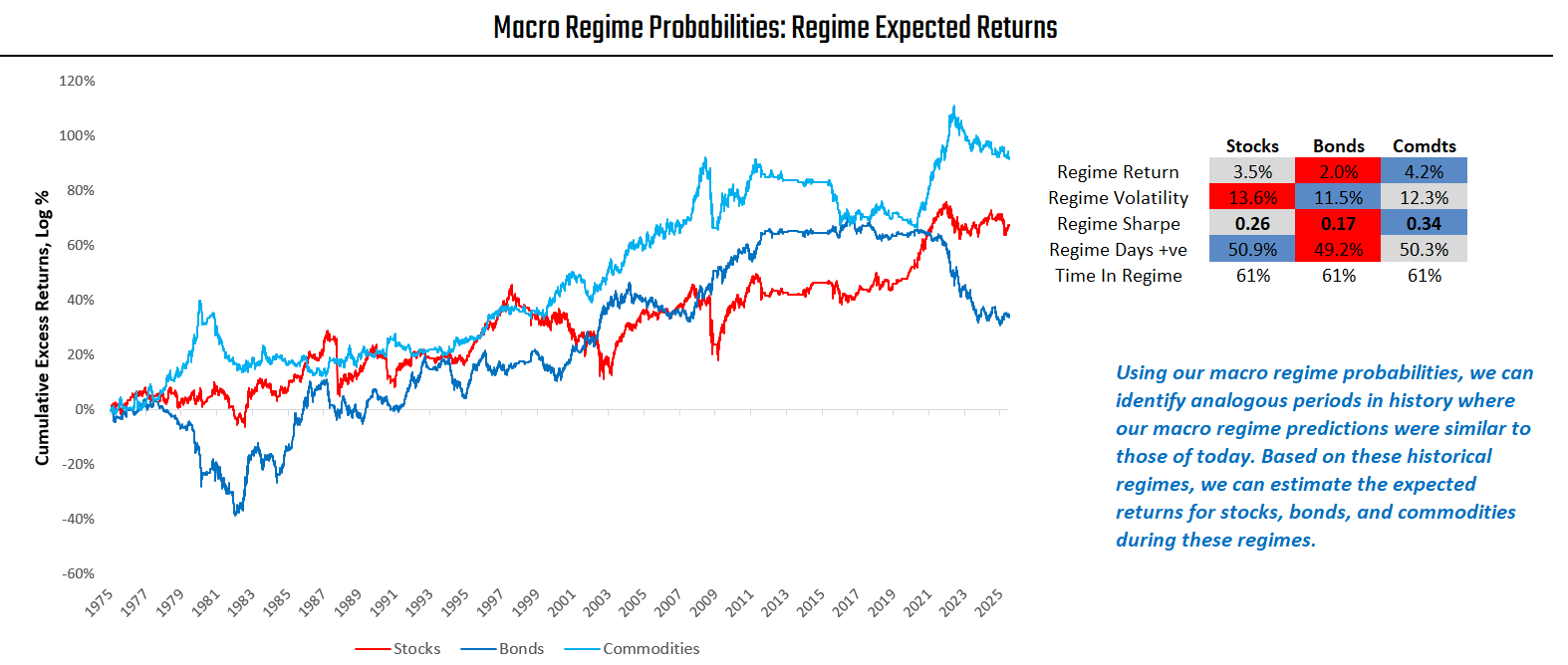 Our Macro Regime Monitors continue to indicate rising growth as the dominant macro regime. We visualize the expected return profiles that one can expect during this distribution of predicted regimes below: