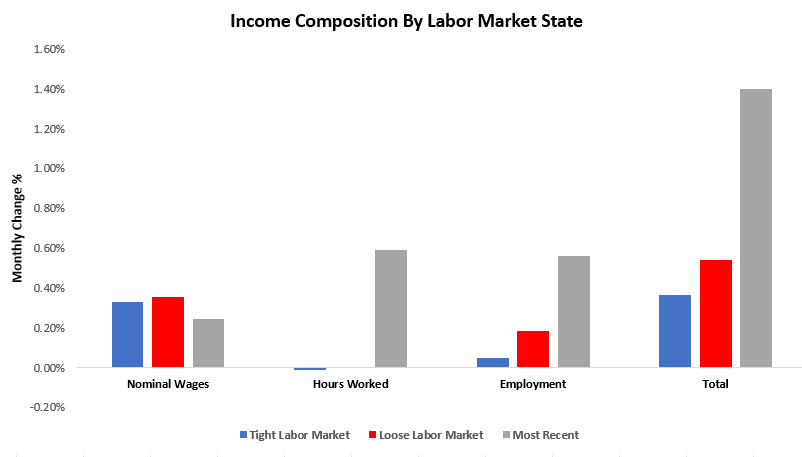 Furthermore, most recent data is inconsistent with previous periods of tight labor markets. Below, we show the 3-month forward change in nominal wages, hours worked, and employment during periods when the labor market was tight or loose. To contextualize, we also show the most recent data prints in grey: