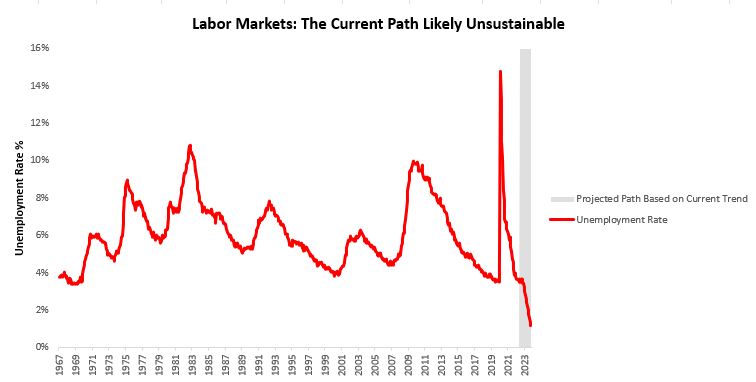 As we can note from the above, labor markets can go through extended periods of tightness, i.e., tightness in itself is not a cause for loosening. However, what we think is even more important to understand is that as the labor market tightens— the potential for further employment gains reduces. This is because, in the ideal state of the world, unemployment can only hit 0%, i.e., begin to move in lockstep with the labor force. Of course, it is practically impossible to have a 0% unemployment rate, and there is likely some natural unemployment rate. With this context in mind, it is essential to realize that the most recent employment data is unlikely to repeat itself on a trending basis. To help visualize this, we show the current path for unemployment based on the recent trend in data: