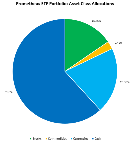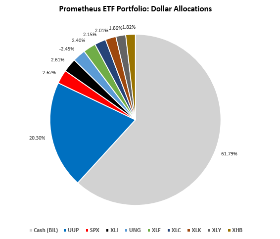 The Prometheus ETF Portfolio was flat on the week at -0.04%. Our equity allocation was generally offside this week, though our losses were somewhat offset by our dollar positions, reflecting our system’s views on tightening liquidity conditions. Overall, the diversification benefit of the portfolio was significant, as expected. Headed into next week, our systems have renewed the same bets, though with less conviction of the equity side and a short position in natural gas: