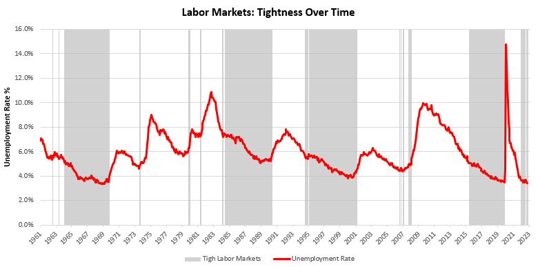Over the last few months, we have entered a period where labor markets are cyclically and secularly tight, with unemployment rates now at 3.4%. Below, we show our assessment of past periods where labor markets have been significantly tight relative to their recent history: