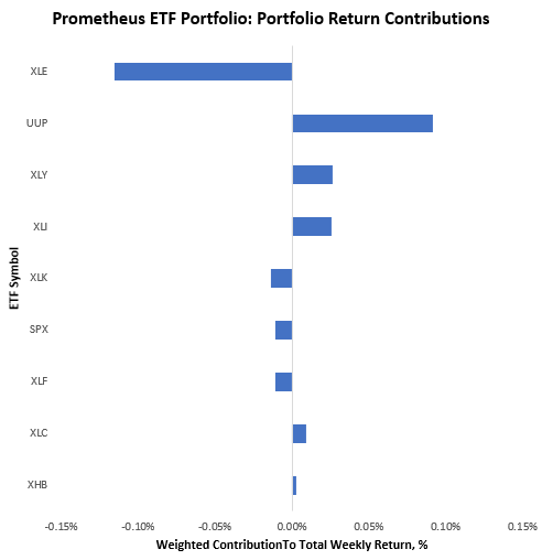 While we remain confident in our assessment of inflation, this week’s market pricing did not support this view but did support our bets o tightening liquidity. Below, we show the attribution of this week’s returns from the Prometheus ETF Portfolio: