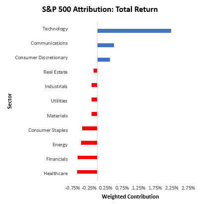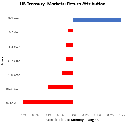 Commodities showed mixed performance, with significant losses during the start of the week weighing on performance. Recent treasury strength continued the recent chop in the market, i.e., moving counter to the recent one-month trend. Below, we show the composition of total treasury market returns over the last month: