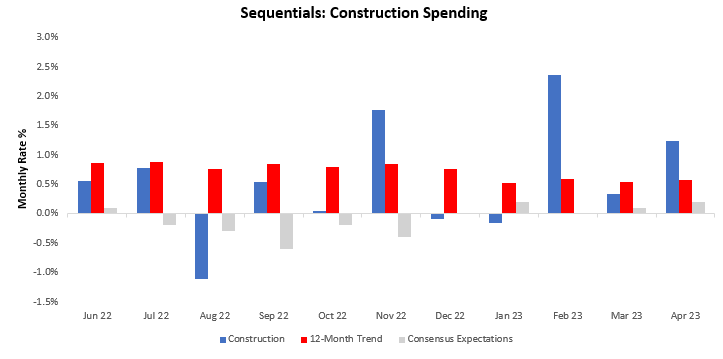 As we can see above, equities continue showing significant trend signal dispersion. We note the trend strength in XHB, i.e., the homebuilders. This is consistent with the recent strength in construction data we received yesterday. The most recent data for April show construction spending increased by 1.24%, with 0.2% and 1.04% coming from residential and nonresidential spending, respectively. This data surprised consensus expectations of 0.2% and contributed to an acceleration in the twelve-month trend.