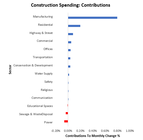 For further context, we show the composition of the most change in monthly construction spending. The strongest contributor to construction spending in April was Manufacturing, while the weakest was Religious construction spending: