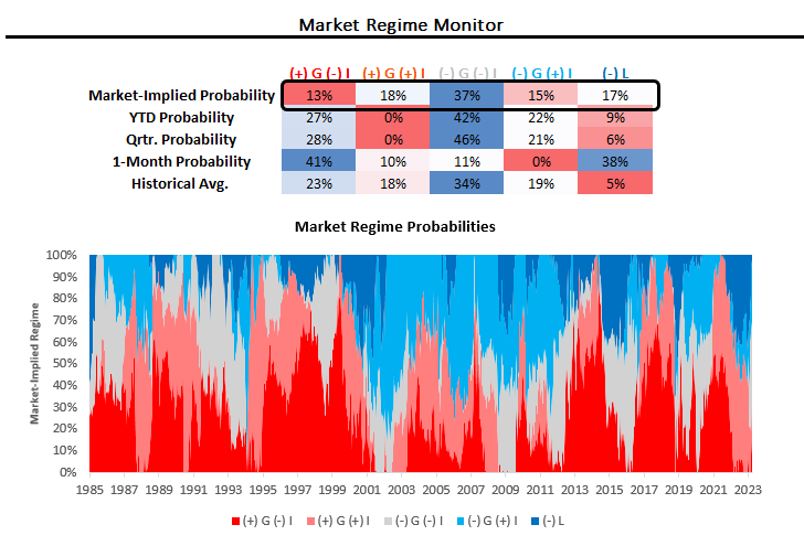 The combination of these moves has improved the odds of a rising growth market regime over the last month. These changes continue to keep the distribution of market regime probabilities as highlighted below: