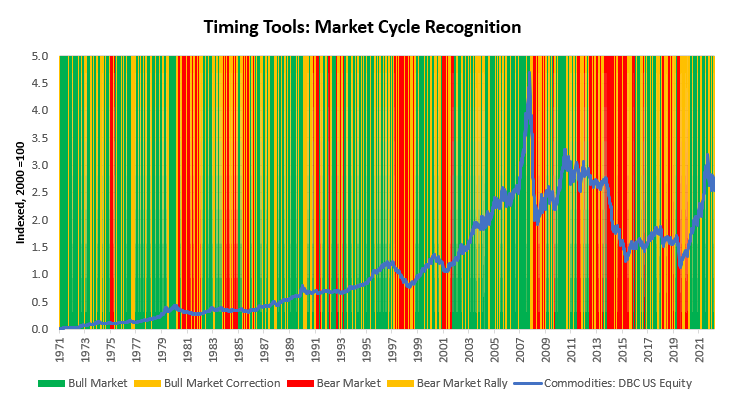 The allocation above has an expected volatility of 7.5%, with a maximum expected volatility of 10%. Given the concentration of positions in commodities, the portfolio has significant potential to achieve maximum volatility. Overall, our positioning reflects the predominance and persistence of stagflationary nominal growth. The potential for slowing inflation remains in place, but the first derivatives of inflation remain elevated. We continue to allocate with the cycle. For additional color, we share some of our market timing tools to help contextualize the positions within the broader economic context.