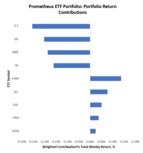 Our team is taking a short break for the holiday season this week, so we’ll keep our commentary concise for this note. This week, the Prometheus ETF Portfolio was down 0.50% due to weak performance in fixed-income positions. A large portion of this weakness came amidst a global policy shock from the BOE, ECB, and BOJ, which came together to pull capital from US assets to the countries of these respective central banks. This shock was not a significant deviation from our fundamental outlook of weakening growth and stabilizing high inflation amidst a tightening liquidity backdrop. Below, we show the contributions to this week’s returns: