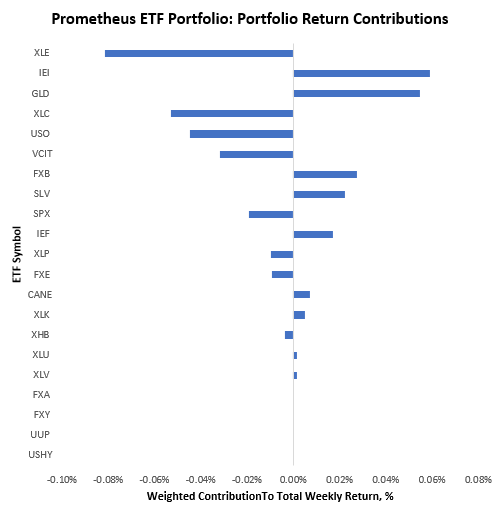 This week, we will keep this note limited to new positions to allow readers to focus on the takeaways from our latest Month In Macro note released earlier today. The Prometheus ETF Portfolio was down 0.1%, while a 60/40 stocks & bonds portfolio was down 0.40%. Diversity was protected in this environment as expected, though it was largely downside mitigation.