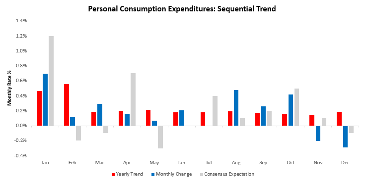Translating this impact into real spending— real consumption decreased -0.29% in December, disappointing consensus expectations of -0.1%. This print contributed to a sequential deceleration in the quarterly trend relative to the yearly trend. Below, we show the monthly evolution of the data relative to its 12-monthly trend and consensus expectations: