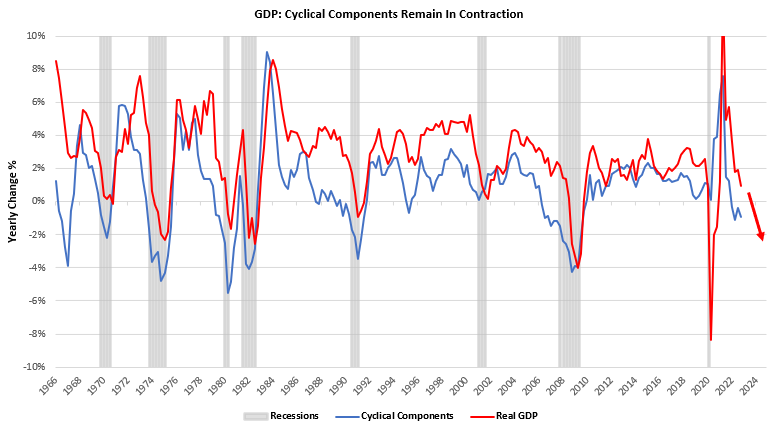 Within this aggregate spending, it is important to recognize that cyclical components of GDP, i.e., those most exposed to the credit cycle, are contracting, and their weakness is likely to flow through to future income and spending. We show this below: