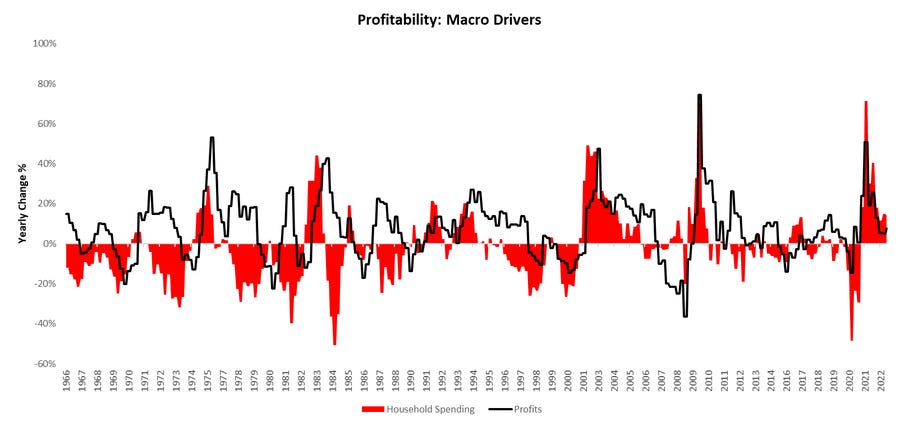 After taking a break for the holiday season, our team will resume publishing Month In Macro for 2023, starting with the January edition. We highly recommend you catch up on our outlook before our next release. We received incremental information in the form of GDP data this week. While many remain focused on the headline print, we think the value of the GDP data is in gaining further clarity on the forces at play in the broader economic cycle. As we have said here in several notes, the next steps in the economic cycle will be determined by the severity of a building profit contraction. The latest GDP data affirmed our understanding that pressures on corporate profitability are in place, though they eased somewhat in the fourth quarter of 2022. Our latest estimate shows YoY profits at approximately 8%. We show this below: