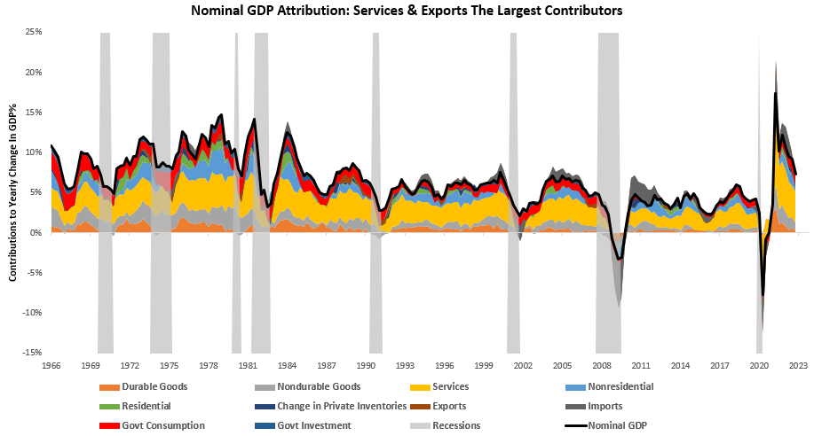Therefore, while current aggregate nominal spending is supportive of profitability and the continuation of the economic cycle, pressures are building for the nominal pie to shrink as well. Nonetheless, currently, nominal spending has been net support to profits.