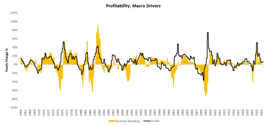 Turning to our second method of understanding profits— within this nominal GDP pie, households, businesses, the foreign sector, and governments vie for surpluses at the expense of each other. The more any of the non-business parties spend vs. their income, the more profitable businesses can be. sing this approach; we can understand where current profits are coming from. In the current setting, we are seeing a large drag on profitability coming from businesses' own spending, i.e., their reinvestment. We show this drag below: using this approach, we can understand where current profits come from. In the current setting, we are seeing a large drag on profitability coming from businesses' own spending, i.e., their reinvestment. We show this drag below: