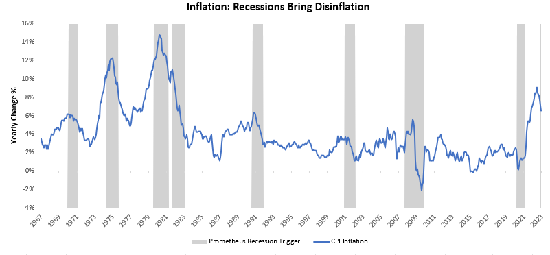 What is important to recognize here is that the build-up of potential recessionary activity bodes ill for nominal spending and, in turn, inflation. Below, we show inflation during periods where our future estimates flagged potential recessionary conditions: