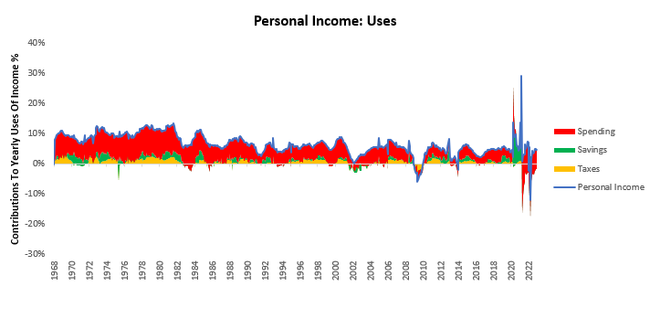 However, it is important to recognize that household savings rates are at historic lows, and the outlook for income growth remains weak. The combination of these factors bodes ill for household spending. We received incremental information in this direction today. Personal Income increased in December, and this income was primarily saved. Income increased as taxes remained flat, savings increased by 0.4% & spending decreased by 0.18%. We show the composition of these uses of nominal income below: