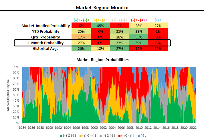We see markets beginning to price these expectations, with falling growth and falling inflation cumulatively occupying strong market odds in our market regime monitors over the last month: