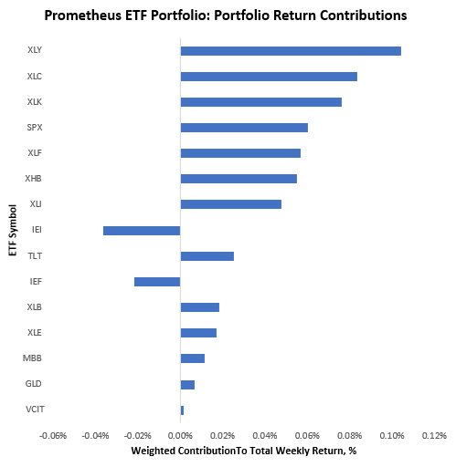 Decelerating nominal activity remains the most likely outcome based on our outlook. In a decelerating nominal world, we likely experience the inverse of what we experienced in 2022, i.e., stocks and bonds will likely perform far better than they did in 2022. Make no mistake; we currently expect a transition into a real GDP contraction. However, the exact time to get there remains uncertain. Meanwhile, traditional allocations will likely have a period of reprieve from inflation and policy shocks, which is what we are seeing today. Timing is everything, and our systems attempt to thread the needle and, thus far, have done well in navigating this transition— being long stocks & bonds this week. This positioning resulted in a gain of approximately 0.60%. We show the contributions to these gains below: