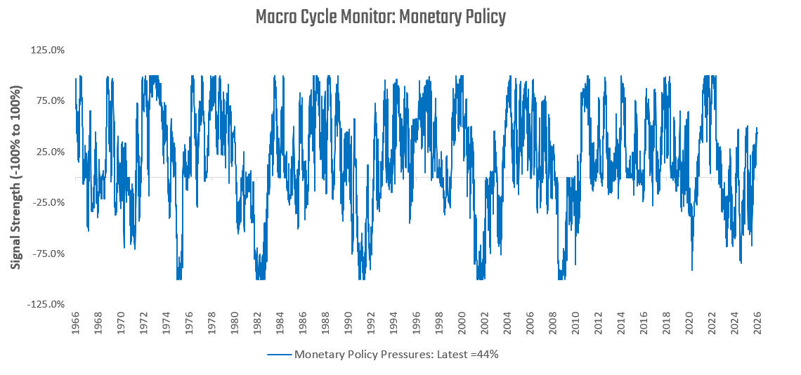Our latest readings continue to show consistent signs of an expanding business cycle. Next, we turn to monetary policy pressures. Our monetary policy gauges measure the pressures on the Federal Reserve to move monetary policy based on the trade-off between growth and inflation data. The higher our readings, the more pressure there is to hike policy rates. The lower the gauge, the more pressure there is to cut policy rates.