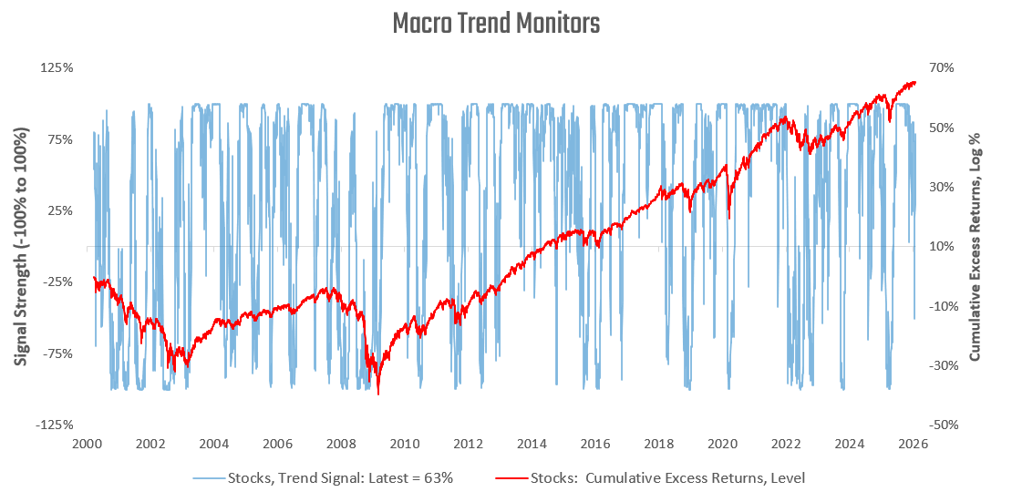 Asset prices in aggregate reflect changes in conditions relative to expectations. As such, carefully monitoring macro market trends is an integral part of evaluating conditions in the macroeconomy. To do this, we use our macro trend monitors, which we share here. We begin with stocks: