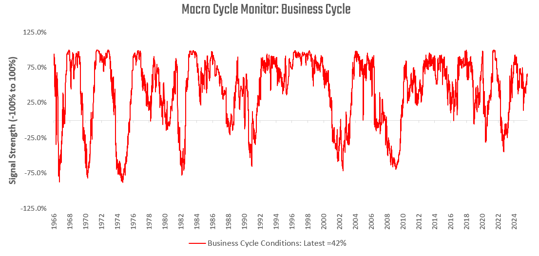 Our systems aggregate a wide range of fundamental economic data to produce timely, proprietary estimates of the current stages of the macro cycle. We share some of these gauges, starting with our signals for business cycle conditions: