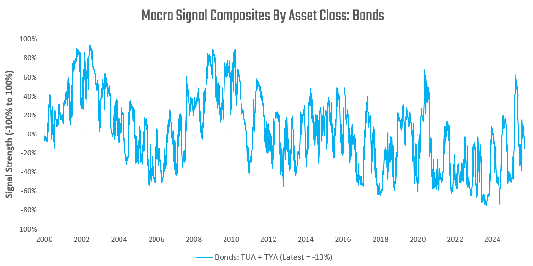 Equities continue to present a moderately positive signal strength, supporting moderate exposure. Next, we turn to our bond signals for an equal-weighted blend of TUA and TYA: