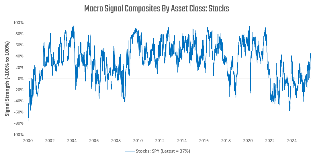 Using the macro cycle gauges, adding asset-specific factors, and leveraging carry, trend, and reversion, we can create asset-class-specific composite signals. We share these signals below and their latest readings. These signals are proportional to our conviction for a given asset and are directly tradeable. We begin with our stock signals for SPY: