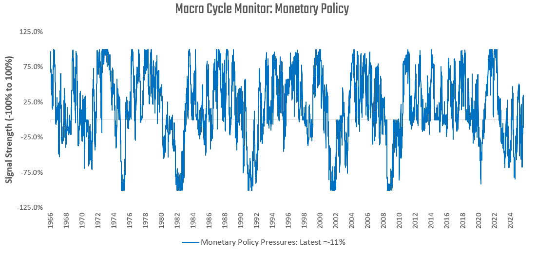 Our latest readings continue to show consistent signs of an expanding business cycle. Next, we turn to monetary policy pressures. Our monetary policy gauges measure the pressures on the Federal Reserve to move monetary policy based on the trade-off between growth and inflation data. The higher our readings, the more pressure there is to hike policy rates. The lower the gauge, the more pressure there is to cut policy rates.