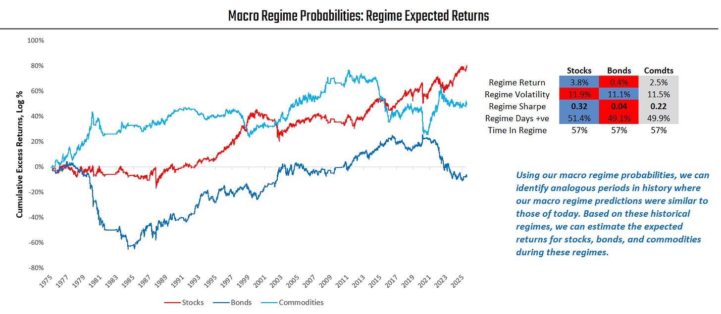 Our Macro Regime Monitors show that the distribution of regime probabilities is dominated by rising growth and falling inflation. We visualize the expected return profiles that one can expect during this distribution of predicted regimes below: