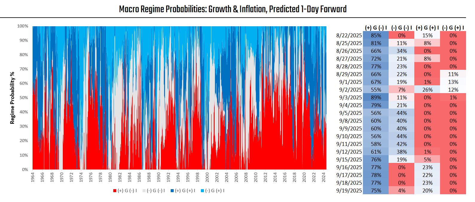 Our forward-looking macro regime probabilities show a dominance of rising growth and falling inflation outcomes.