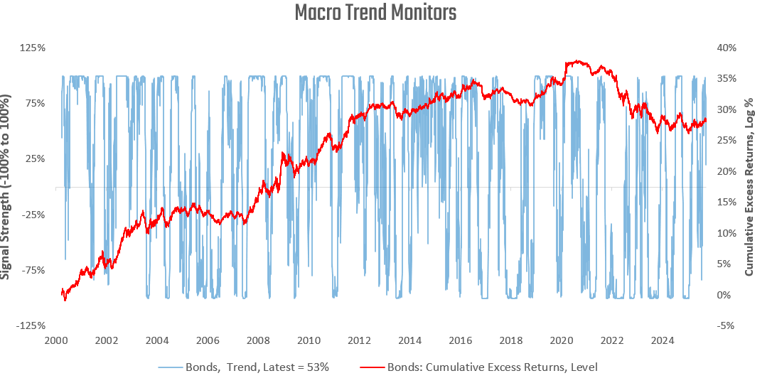 Equities continue to show extremely strong trend signals. Next, we turn to bond market trends: